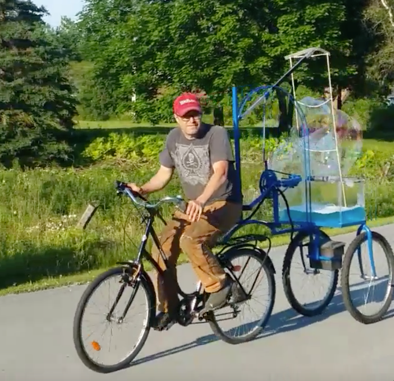 I used mostly scrapped bicycles, a car window motor, and motor driver I got from the suplus section at Princess Auto. Mash them altogether and BANG! you have a mobile giant bubble machine.
