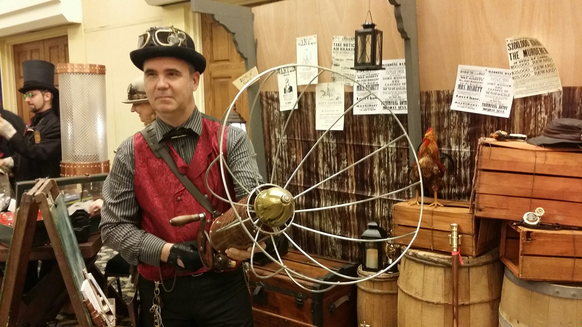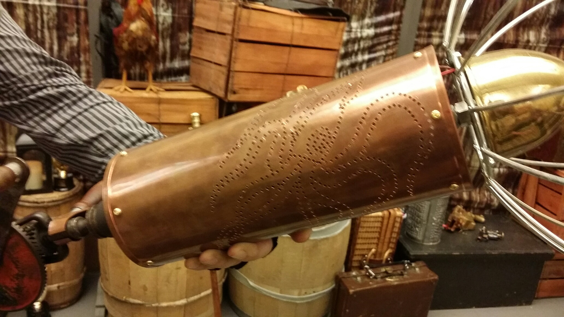 Found an ancient hand drill in an antique shop, and the idea about how to deal with those pesky Air Krakens came to me. Formed and drilled a decorative copper tube to house the electronics and LEDs. Re-purposed a wire frame from a lampshade. And BAM! say goodbye to Air Krakens.