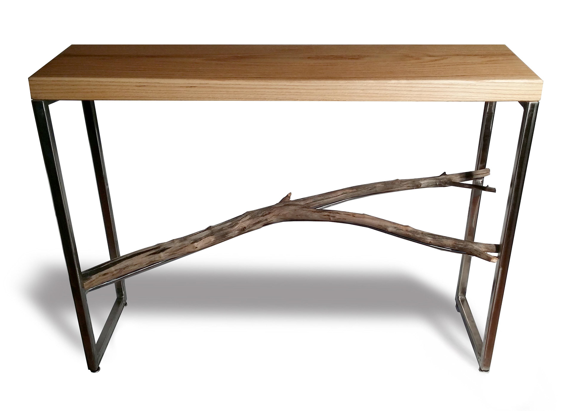 A solid flat hardwood top with stainless steel legs and a piece of driftwood for support. Actually, the driftwood just sits on stainless steel round bar that follows the shape. The end result is a nice nautical table with a cottage feel perfect for a lakefront home.
