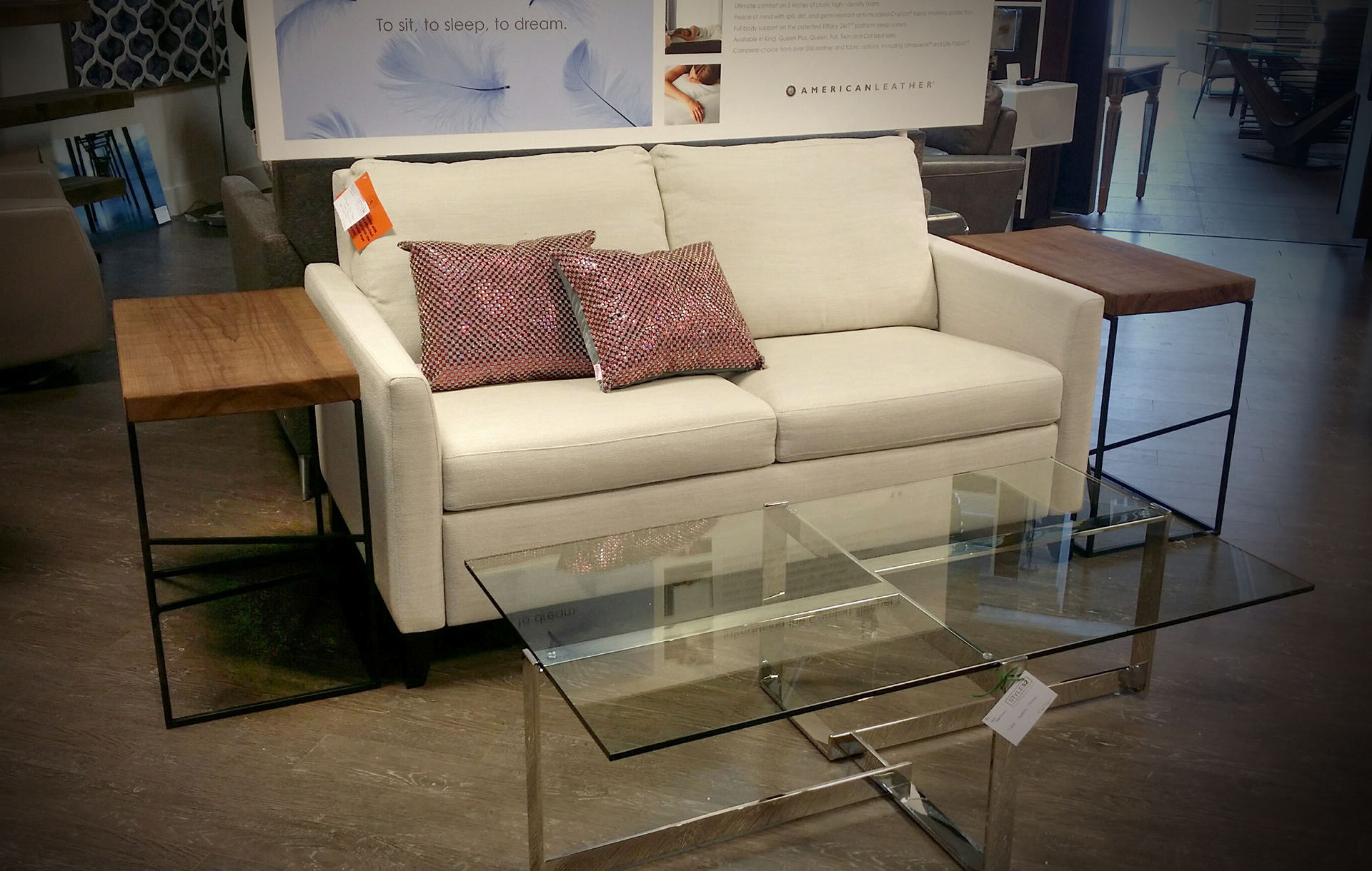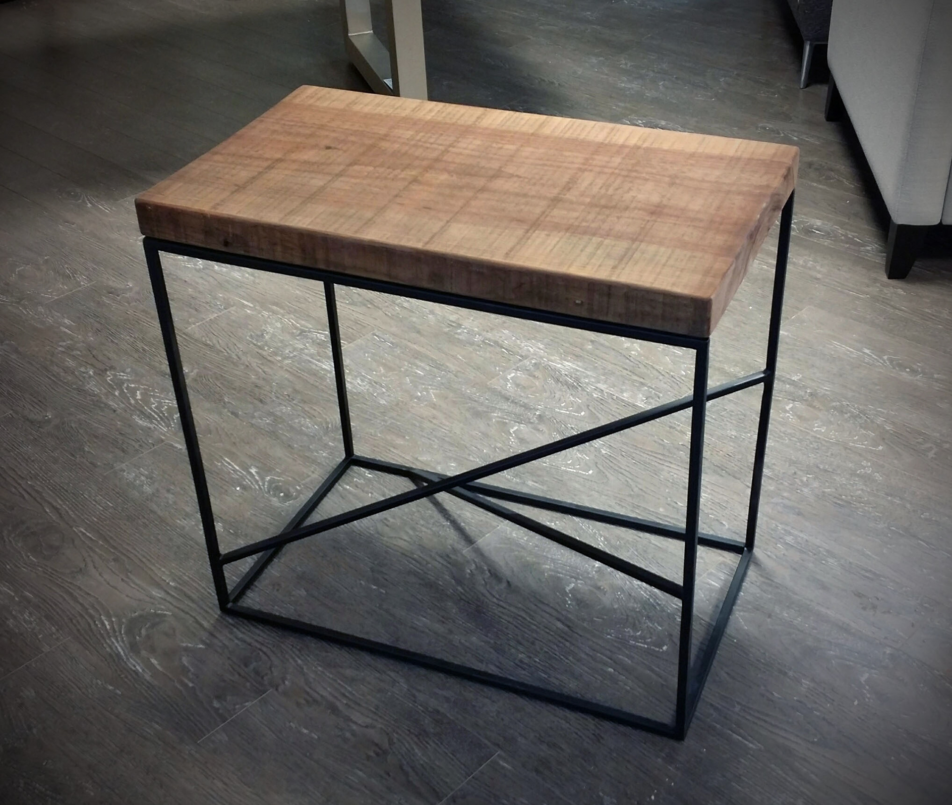 Custom end tables featured a pine top and asymmetrical leg design. As you move around the room, the design changes with your perspective.