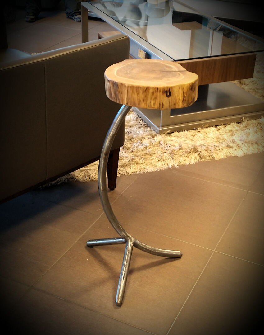Curved steel tripod base with a Maple top. The base was clear coated and the top was hand rubbed with Danish Antique Oil for a velvet finish.