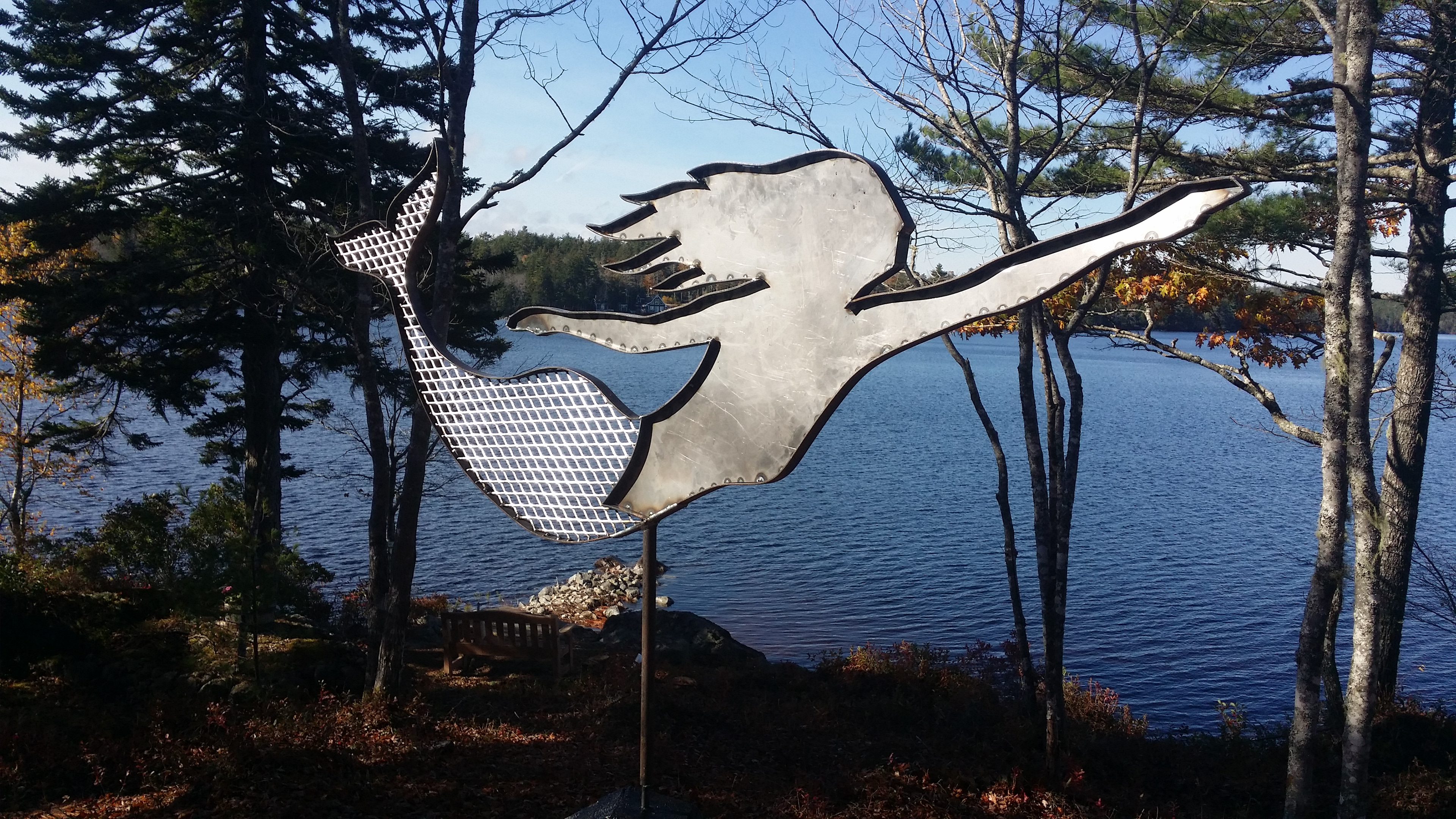 Metal mermaid sculpture that moves with the wind. It's mounted between the home owner's deck and the beautiful lake. It's a large piece measuring approx. 5 1/2 feet.