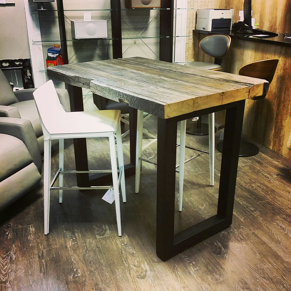 Found some beautiful grayed out wood (approx. 100 years old) that originally came from a warehouse rafter, and decided to create a gathering table. I loved the character of the wood, so I kept as many unique qualities as I could. To keep the nice gray finish, I used a new product (new to me) that protects the wood while maintaining the colour. The base was formed from three-inch square steel and painted flat black to bring the focus to the wood top. It's currently being displayed at Style 52 in Bayer's Lake, Halifax.