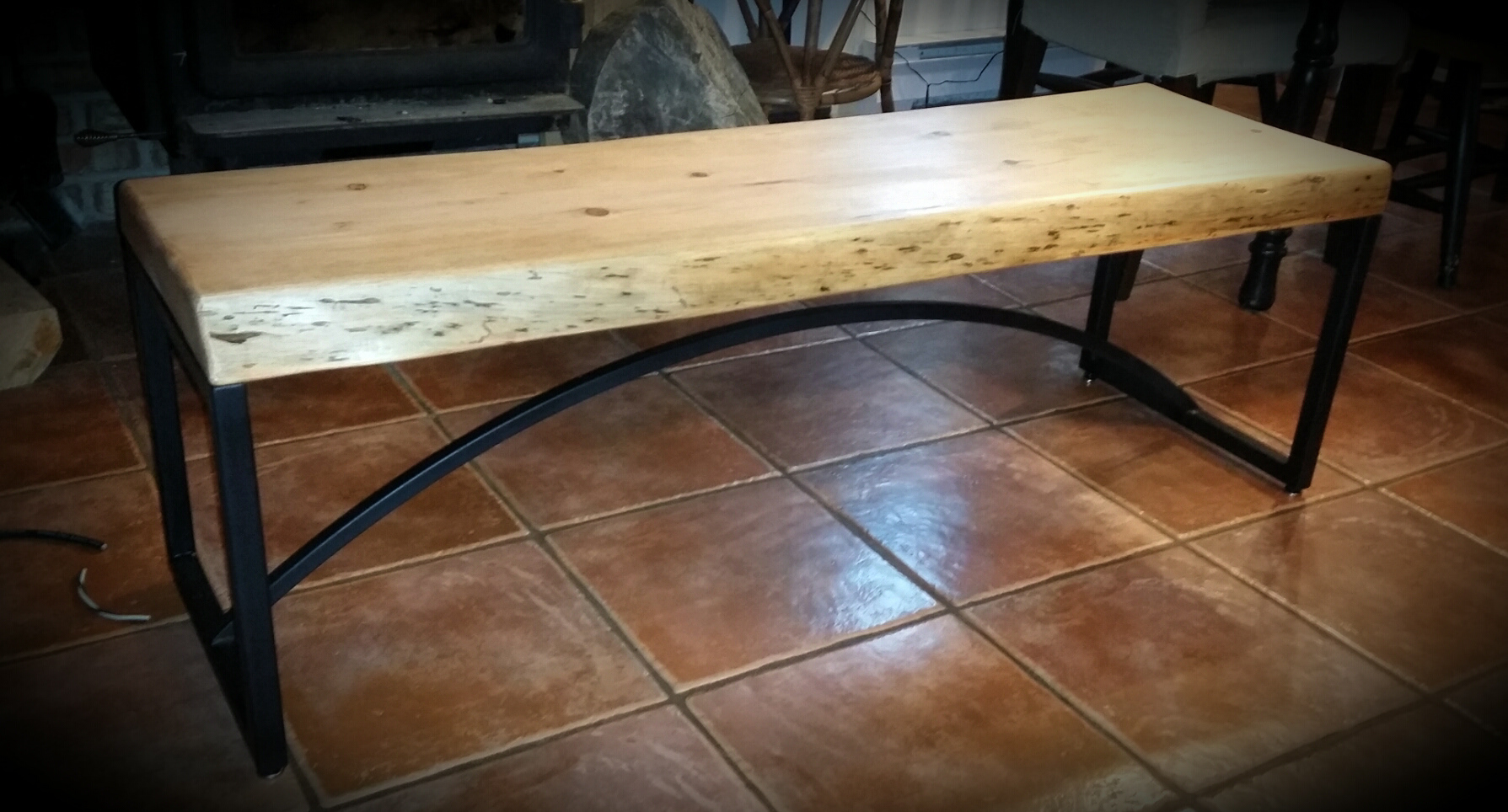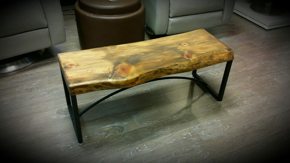 Live edge pine slab benches with steel flat black legs.