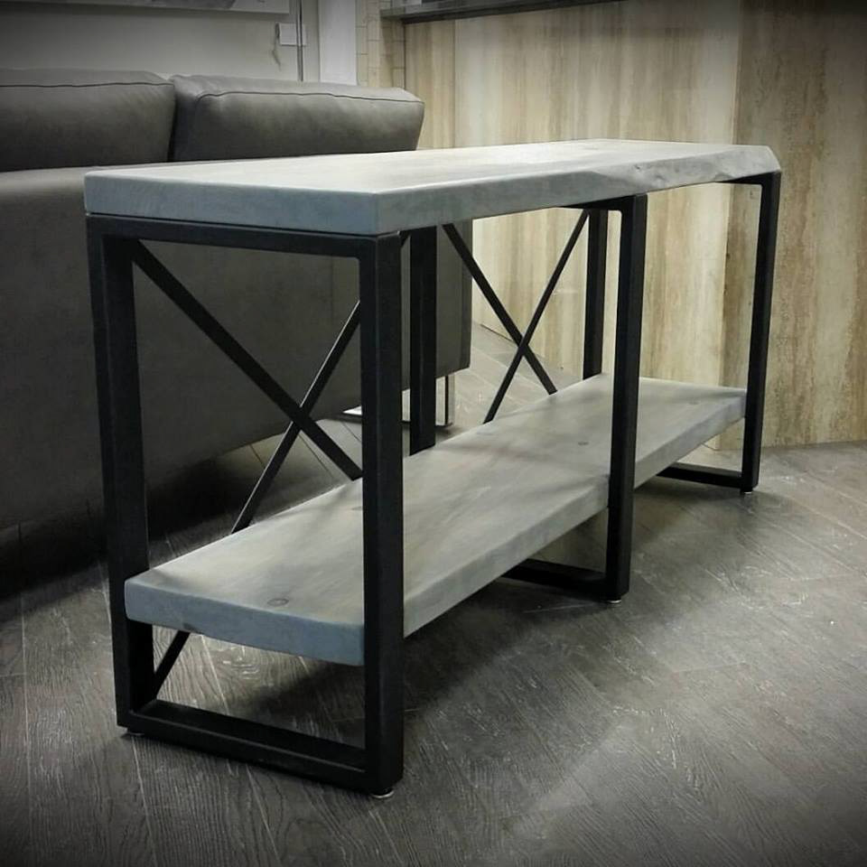 Modern sofa table created from two-inch thick pine and 1"x2" steel tubing. The cross braces are 1" wide flat steel. The legs were painted flat black to highlight the gray-stained wood. There is a nice live edge on the right side of the top that helps make the piece unique.