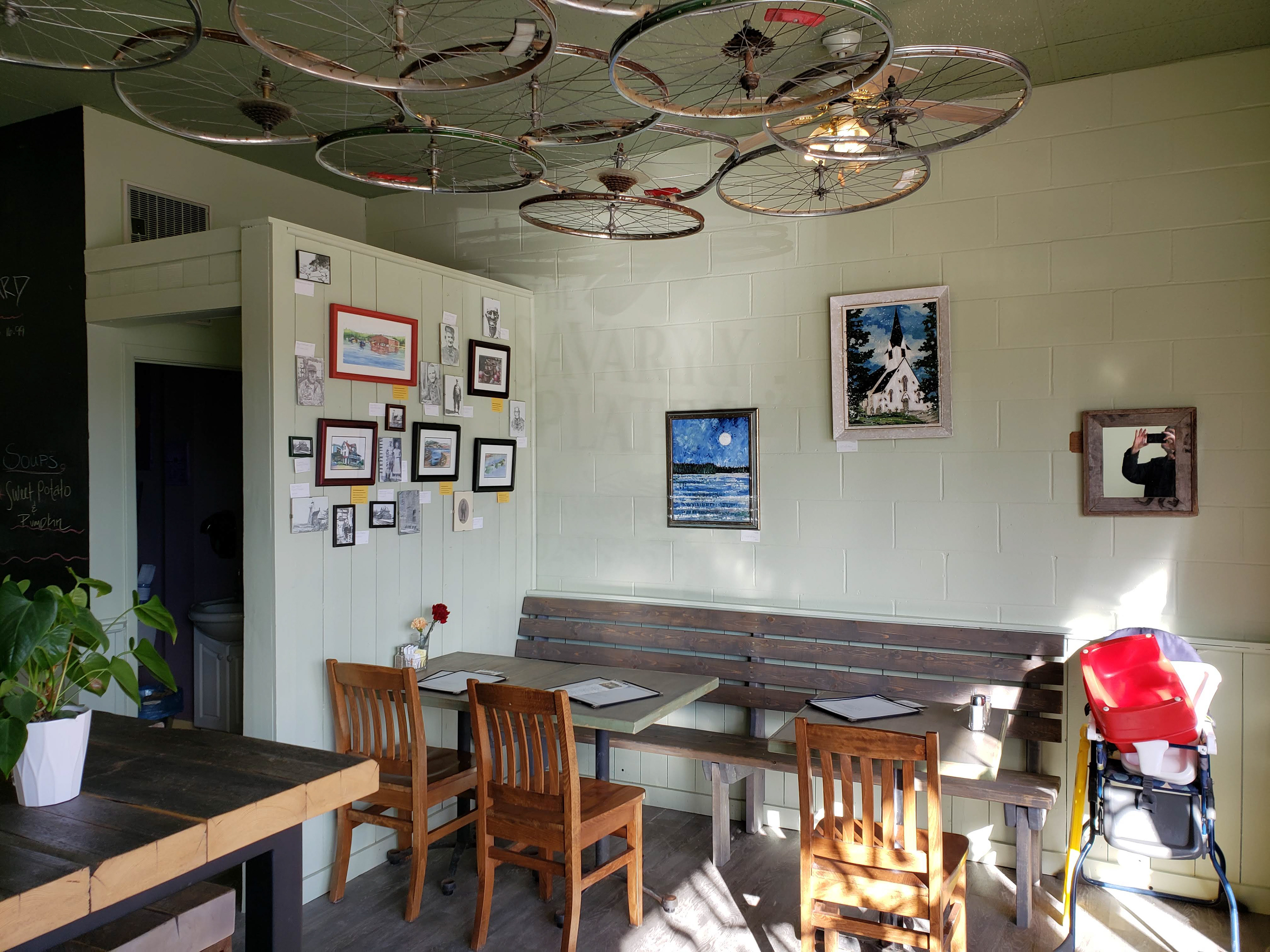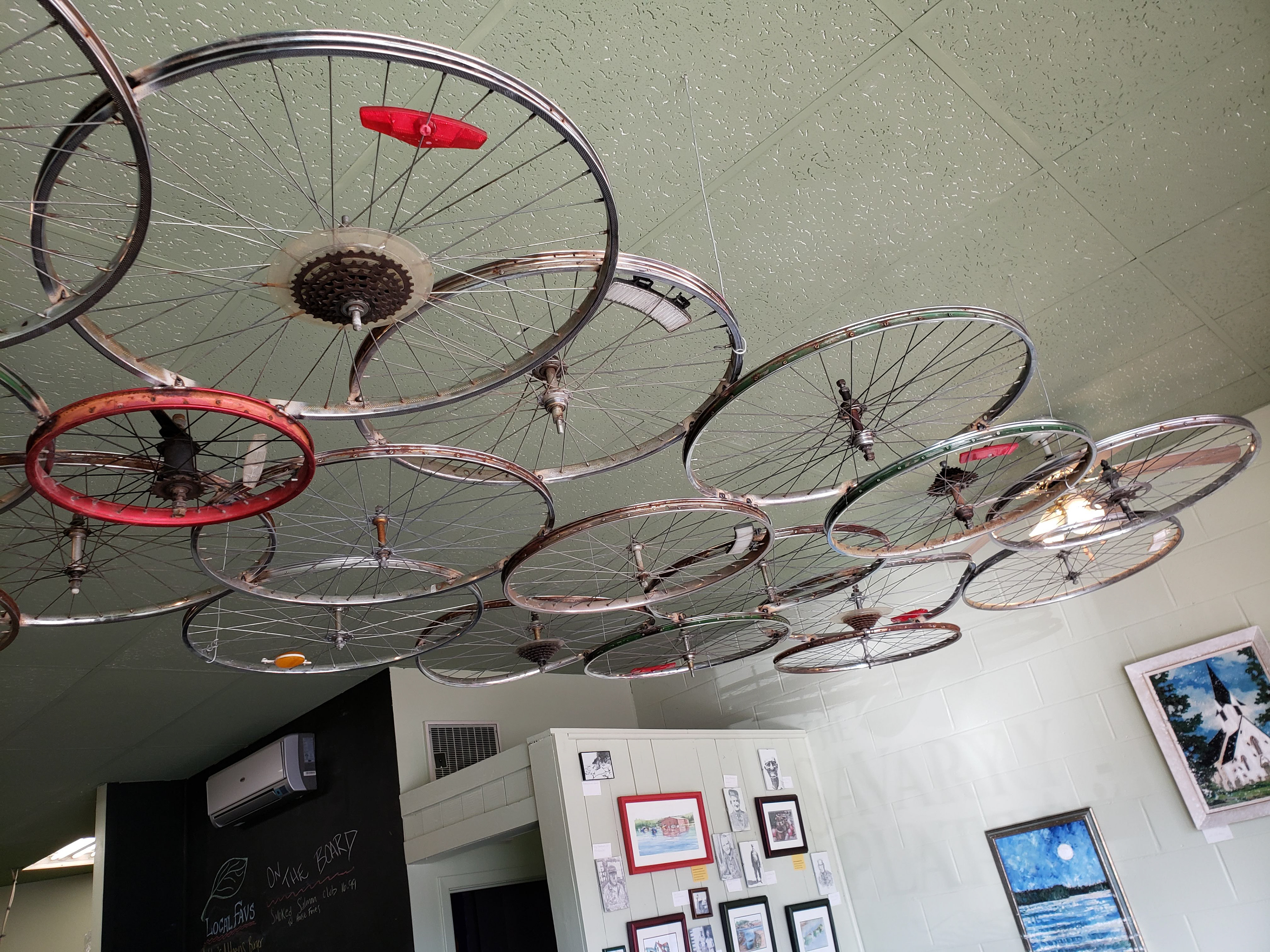 All the work was done between myself, Alisha and her staff. Demo was done. Walls were cleaned up and painted. Replaced and put colour on the ceiling tiles. And a new floor was laid. We found some groovy used table bases and attached our new table tops. The key element in the dining was the long wooden benches that now run down each wall. The tables can be rearranged to accommodate any size group. For a statement piece, I recycled bicycle rims and hung it from the ceiling.